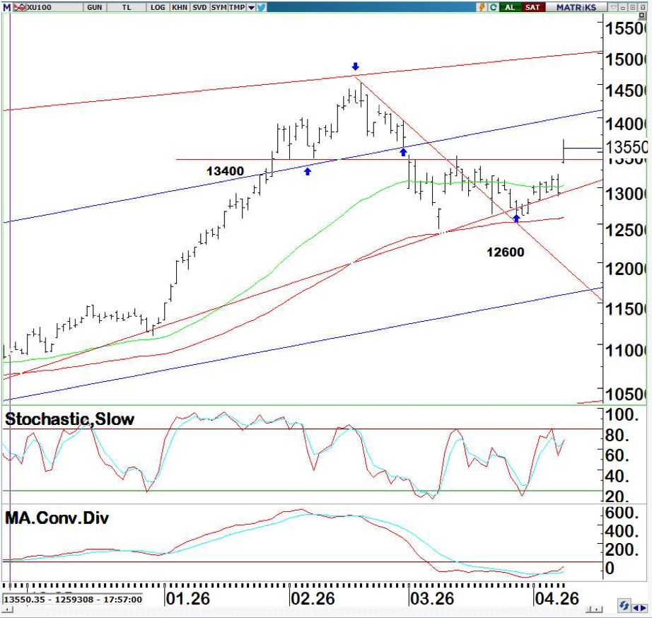 Dün jeopolitik gündemdeki pozitif haber akışıyla beraber güne alıcılı başlayan ve gün boyunca yükseliş eğilimini sürdüren BIST 100 endeksi günü %4,76 oranında değer kazanımı ile 13.536 seviyesinden tamamladı.
