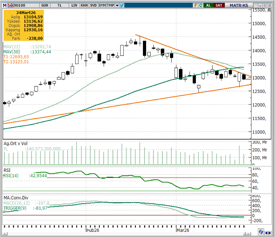 Teknik göstergelere bakıldığında; kısa vadeli indikatörlerde zayıflama eğiliminin sürdüğü, momentumdaki gerileme ve osilatörlerdeki aşağı yönlü sinyallerin satış baskısının devam edebileceğine işaret ettiği görülüyor. Özellikle endeksin 13.000 seviyesi altında kalıcılık sağlaması, kısa vadeli görünümün temkinli kalmasına neden oluyor.