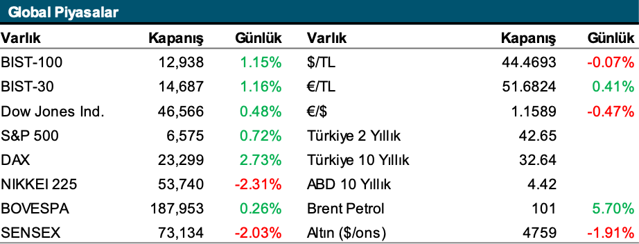 Açılış öncesinde global piyasalara bakıldığında ise satış baskısının daha belirgin olduğu bir güne başladığımız görülüyor. ABD vadeli endekslerinin, dün akşam kapanış saatimizdeki seviyelerine göre yaklaşık %1.5 aşağıda olduğunu, Asya piyasalarında da satışların derinleştiği söylenebilir. Asya’da %2’yi aşan değer kayıpları dikkat çekerken, emtia tarafında Brent petrolün yeniden 100 dolar seviyesinin üzerine çıktığı görülüyor. Yaklaşık %5’lik yükselişle 105 dolar seviyelerinde işlem gören Brent petrol, jeopolitik risklerin fiyatlandığını gösteriyor. Ons altın ise dünkü yükselişin ardından bu sabah saatlerinde %2’ye yakın geri çekilerek 4.603 dolar seviyelerinde hareket ediyor.