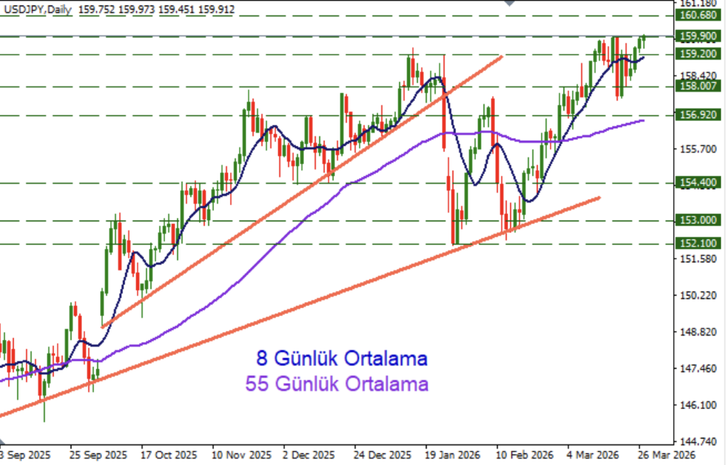 USDJPY paritesi bu hafta genel olarak yen aleyhine fiyatlamaların etkili olduğu bir hafta geçirdi. Fiyatlamalar bugün kritik 159.90 direncini test ediyor. Bu direnç en son test edildiğinde Japon yetkiler tarafından sözlü müdahaleler gündeme gelmişti. Fiyatlamaların 160’lı seviyeleri görmesi durumunda sözlü müdahaleler tekrar gündeme gelebilir. Aşağı yönlü tepkilerde 159.20 bölgesi ilk destek olarak takip edilebilir.