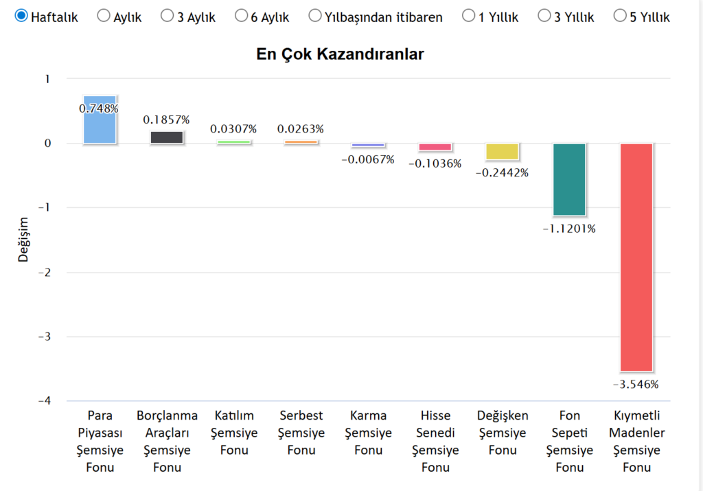 Piyasanın negatif tarafında ise en sınırlı kayıp %0,0067 ile Karma Şemsiye Fonu’nda görüldü. Haftalık bazda değer kaybeden diğer gruplar arasında Hisse Senedi Şemsiye Fonu %0,1036, Değişken Şemsiye Fonu %0,2442 ve Fon Sepeti Şemsiye Fonu %1,1201 oranında düşüş yaşadı. Haftanın en keskin düşüşü ise %3,546 kayıpla Kıymetli Madenler Şemsiye Fonu’nda gerçekleşti.