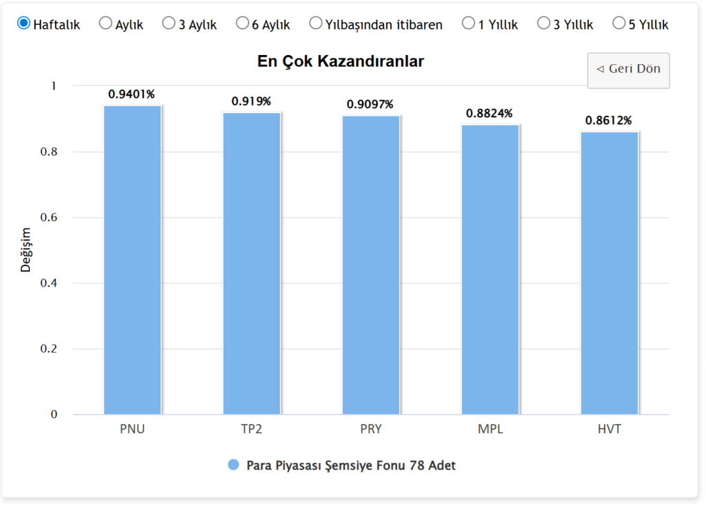 Haftanın en çok kazandıran grubu olan ve bünyesinde 78 adet fon barındıran Para Piyasası Şemsiye Fonu kategorisinde öne çıkan bireysel fonlar da açıklandı. Bu kategoride en yüksek getiriyi %0,9401 ile PNU fonu sağladı. PNU’yu sırasıyla %0,919 ile TP2, %0,9097 ile PRY ve %0,8824 ile MPL fonları takip etti. Listenin beşinci sırasında ise haftalık %0,8612 oranında getiri sunan HVT fonu yer aldı.