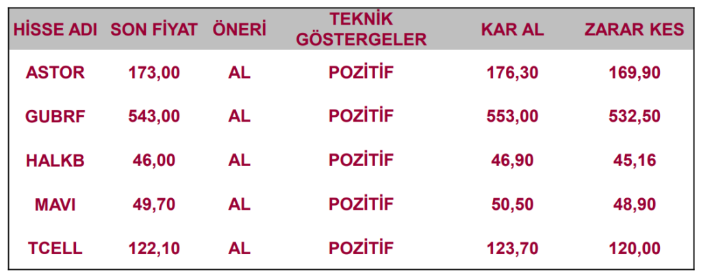 Böylece Alternatif Menkul Değerler, 12 Şubat 2026 tarihli hisse öneri listesinde teknik göstergesi pozitif olan 5 hisseye yer vermiş oldu. İlgili hisseler için “AL” önerisi verildi.