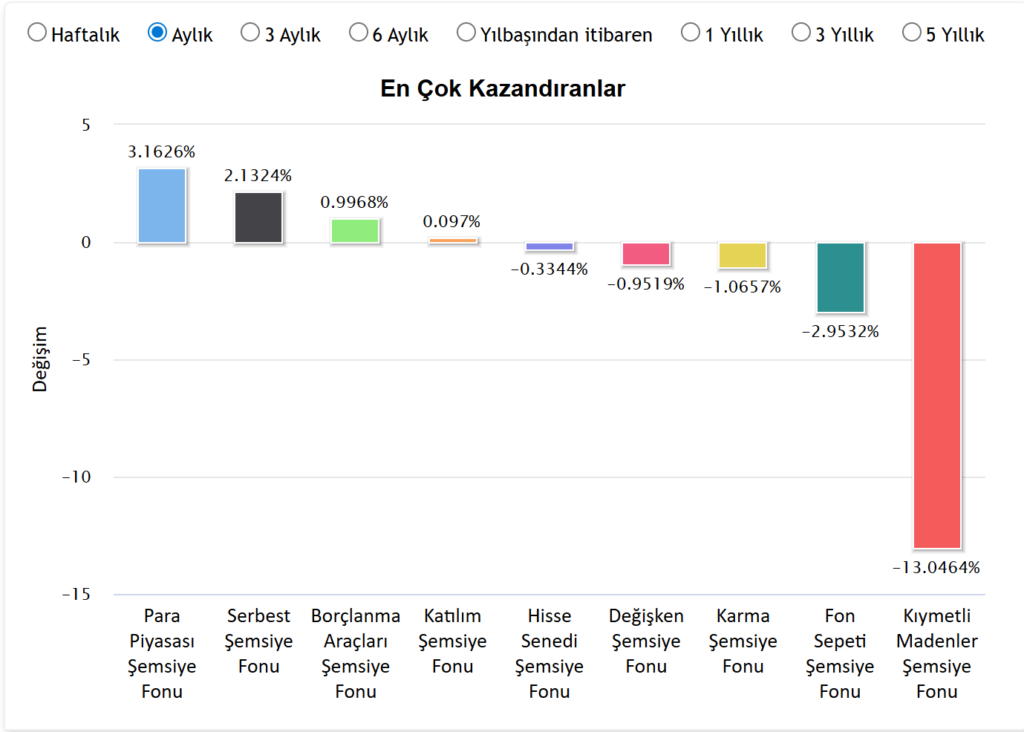 Mart ayı boyunca yatırımcılar için en güvenli ve kazançlı liman Para Piyasası Şemsiye Fonu oldu. Bu fon grubu, aylık bazda %3,16 oranında bir getiri sağlayarak listenin ilk sırasında yer aldı. Onu %2,13 ile Serbest Şemsiye Fonları takip etti. Borçlanma Araçları ve Katılım fonları ise ayı daha sınırlı yükselişlerle, yani %1’in altındaki getirilerle tamamladı.