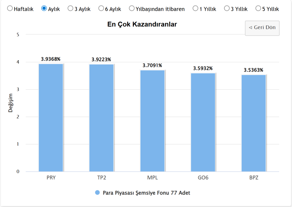 Para Piyasası grubunun kendi içindeki detaylarına bakıldığında ise bazı fonların grup ortalamasının da üzerine çıktığı görülüyor. Bu grupta yer alan 77 adet fon arasından PRY kodlu fon, %3,93 getiri ile liderliği göğüsledi. Onu çok yakın bir oranla TP2 kodlu fon takip ederken; MPL, GO6 ve BPZ kodlu fonlar da mart ayının en başarılı bireysel fonları arasında kendilerine yer buldu.