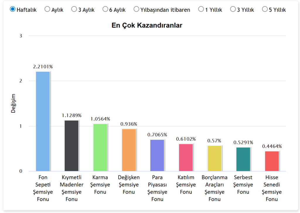 Pay piyasalarındaki son gelişmelere göre, haftalık bazda yatırımcısına en çok kazandıran fon grubu Fon Sepeti Şemsiye Fonları oldu. Bu fon grubu, %2,21 oranındaki artışla listenin ilk sırasında yer alırken, onu %1,12 ile Kıymetli Madenler Şemsiye Fonları ve %1,05 ile Karma Şemsiye Fonları takip etti. Değişken, para piyasası ve katılım şemsiye fonları da haftayı yükselişle kapatan diğer yatırım araçları arasında yer aldı.