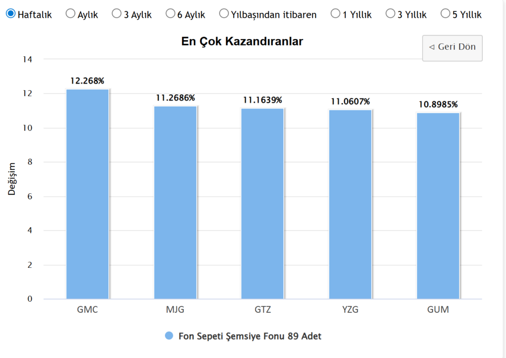 Fon Sepeti Şemsiye Fonu kategorisi altında hizmet veren 89 adet fon arasından bazıları, grubun genel ortalamasının çok üzerinde bir performans sergiledi. Bu alanda en yüksek getiriyi %12,26 ile GMC kodlu fon sağladı. Hemen ardından gelen MJG, GTZ ve YZG kodlu fonlar %11’in üzerinde bir artış yakalarken, GUM kodlu fon %10,89’luk yükselişiyle ilk beşlik listenin sonunda yer buldu.