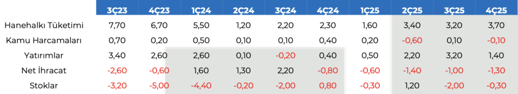 2025 yılının dördüncü çeyreğinde büyümeye puansal bazda hane halkı tüketim, 3,7, yatırımlar 1,4 pozitif etkilerken, kamu harcamaları 0,1 puan, net ihracat 1,3 puan, stoklar 0,3 puan büyümeyi aşağı çekti.