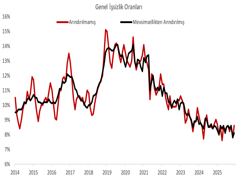 Sonuç olarak, Ocak ayında hem toplam hem de tam zamanlı istihdamdaki düşüş ve geniş tanımlı işsizlik göstergelerindeki yükseliş iş gücü piyasasına dair negatif sinyaller verdi. 2026 yılı ilk çeyrek öncü verileri ekonomik aktivitedeki görece yatay seyrin sürdüğüne işaret ediyor. 2026 yılında büyümenin bir miktar hızlanması beklense de, bu gelişmenin istihdam rakamlarına olumlu yansımasının yılın ilerleyen dönemlerinde gerçekleşebileceği değerlendiriliyor.