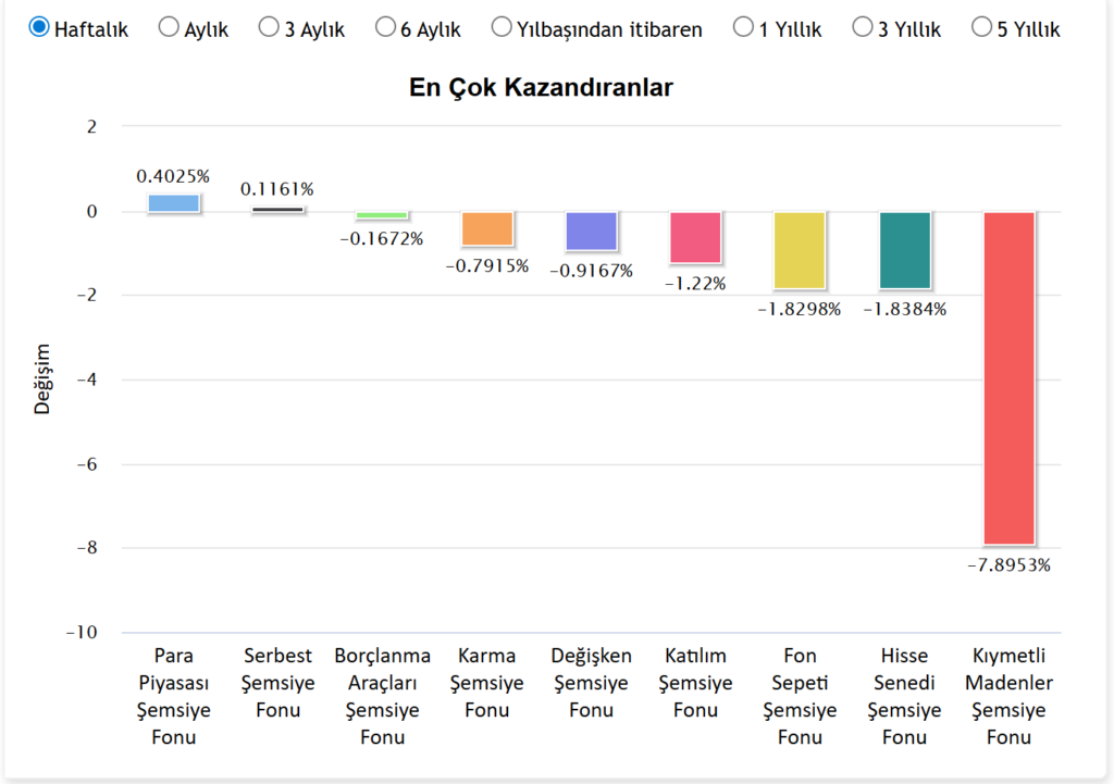 Haftalık bazda en iyi performansı %0,4025 oranında yükselişle Para Piyasası Şemsiye Fonu gösterdi. Onu %0,1161 artışla Serbest Şemsiye Fonu takip etti. Bu iki fon grubu dışında kalan tüm ana kategoriler haftayı düşüşle kapattı. Değer kaybı yaşayanlar arasında en düşük düşüş -%0,1672 ile Borçlanma Araçları Şemsiye Fonu’nda görülürken, en derin kayıp -%7,8953 ile Kıymetli Madenler Şemsiye Fonu tarafında kaydedildi.