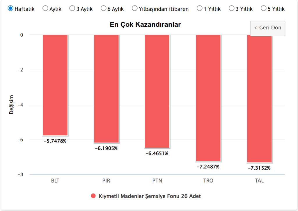 Haftanın en çok kaybettiren grubu olan Kıymetli Madenler Şemsiye Fonu içerisinde yer alan bazı fonların detayları da ikinci görselde yer almaktadır. Bu grupta bulunan 26 adet fonun genel bir düşüş eğiliminde olduğu görülmektedir.