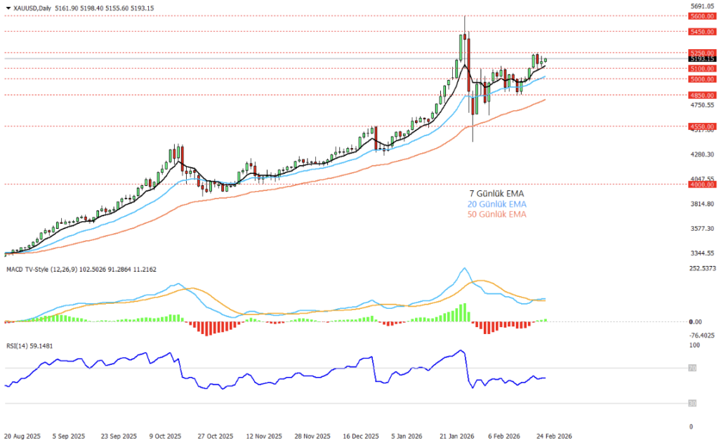 Günlük grafikte 5190 civarlarında seyreden altın gün içinde ABD-İran görüşmelerinin seyrine göre 5250 direncini test edip kırabilir. Önceki günlerde 2 defa test etmiş ama buradan bir satış yemişti, jeopolitik risk desteği artarsa bugün bu seviyenin kırıldığını görebiliriz.