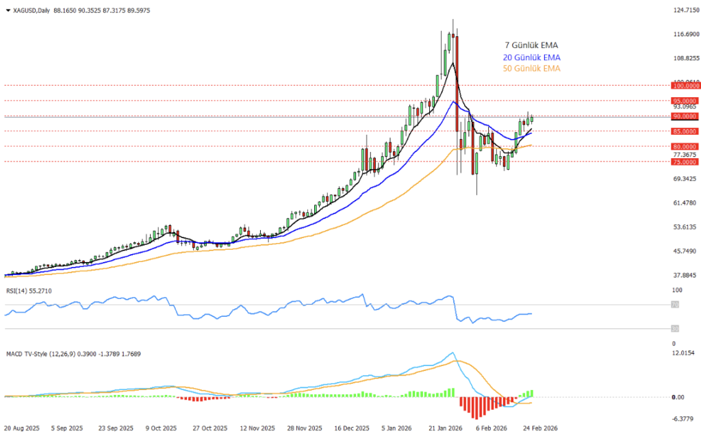 Ons Gümüş günlük grafikte sert rallinin ardından yaşanan düzeltme sonrası yeniden toparlanma denemesi öne çıkıyor fiyat yaklaşık 89,35 civarında ve 7 günlük EMA yukarı eğimle fiyatın altında kalarak kısa vadeli momentumu desteklerken, 20 günlük EMA’nın (mavi) üzerine yerleşme çabası trendin yeniden güç kazanması için kritik görünüyor Momentum tarafında RSI ~55 ile nötr-pozitif bölgede (aşırı alım değil ve MACD’de negatif bölgeden yukarı toparlanma dikkat çekiyor histogramın iyileşmesi düşüş ivmesi zayıflıyor mesajı veriyor.
