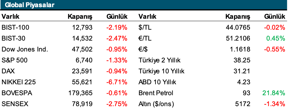 Emtia tarafında ise Brent petrolde 114 $ seviyesinin test edilmesi sonrasında an itibariyle %14’i aşan değer kazanımıyla 104 dolar seviyelerinde işlemler gerçekleşiyor. Ons altın %1’e yakın sınırlı değer kaybıyla 5,093 dolar seviyelerinde fiyatlanıyor.