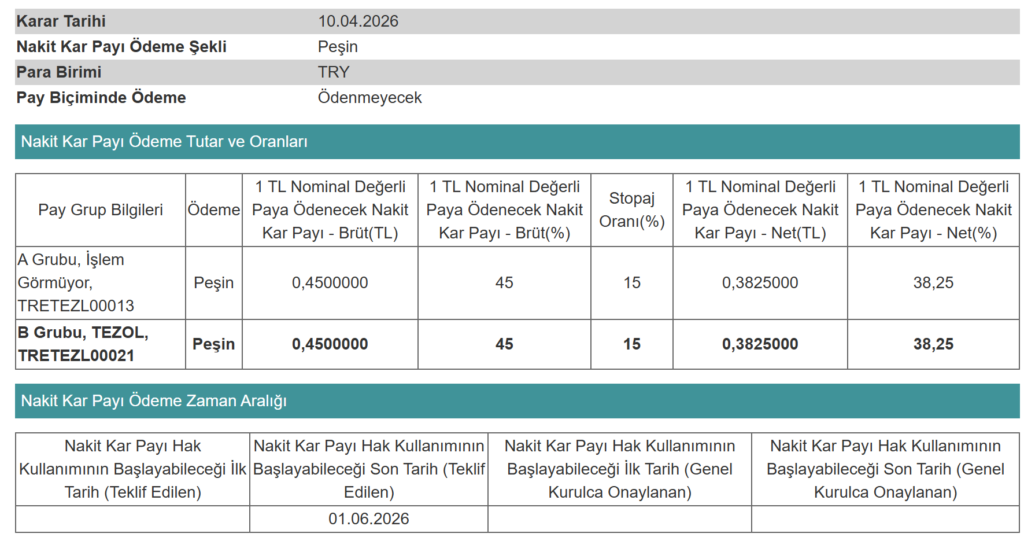 Europap Tezol Kağıt Sanayi ve Ticaret A.Ş., yatırımcılarını yakından ilgilendiren nakit kar payı ödeme kararını duyurdu. Şirketin yönetim kurulu tarafından 10 Nisan 2026 tarihinde alınan bu karar, Kamuyu Aydınlatma Platformu üzerinden paylaşıldı.