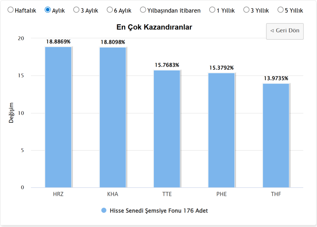 Ayın lideri olan Hisse Senedi Şemsiye Fonu kategorisindeki bireysel fonlara bakıldığında, bazı fonların ortalamanın çok üzerine çıktığı görülüyor. HRZ kodlu Aktif Portföy BIST Halka Arz Şirketleri Fonu, %18,88 getiriyle zirvede yer aldı. Onu hemen ardından %18,80 yükselişle Pardus Portföy’ün KHA kodlu fonu izledi.