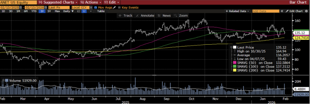 ANET, veri merkezi ve kurumsal ağlar için yüksek performanslı anahtarlama ve yönlendirme çözümleri geliştiriyor. Şirket, bulut bilişim, büyük ölçekli veri merkezleri ve yapay zekâ altyapılarına yönelik ağ işletim sistemi ve yazılım odaklı ürünler sunuyor. Hisse için Bloomberg’de yer alan analist beklentileri 12 aylık vadede ortalama 177,21 USD hedef fiyata ve son kapanış fiyatına göre %31,2 getiri potansiyeline işaret ediyor. S&P 500 endekisinin üzerinde bir getiri potansiyeline sahip olsa da, önümüzdeki dönemde hedef fiyatın yapılacak revizyonlarla endeks getirisinin üzerinde kalacağını öngörüyoruz. Hisse için 24 analist AL, 4 analist TUT tavsiyesi veriyor. Teknik açıdan yakın vadede 150 USD direnç, 125 USD ise destek seviyesi olarak takip edilebilir.