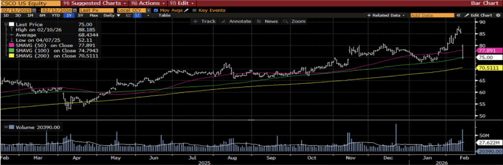 CSCO, ağ altyapısı, siber güvenlik ve kurumsal iletişim çözümleri geliştiriyor. Şirket, veri merkezleri ve bulut ortamları için donanım, yazılım ve abonelik bazlı hizmetler sunuyor. Hisse için Bloomberg’de yer alan analist beklentileri 12 aylık vadede ortalama 89,74 USD hedef fiyata ve son kapanış fiyatına göre %19,7 getiri potansiyeline İşaret ediyor. S&P 500 endekisinin üzerinde bir getiri potansiyeline sahip olsa da, önümüzdeki dönemde hedef fiyatın yapılacak revizyonlarla endeks getirisinin üzerinde kalacağını öngörüyoruz. Hisse için 17 analist AL, 9 analist TUT tavsiyesi veriyor. Teknik açıdan yakın vadede 79 USD direnç, 72,5 USD ise destek seviyesi olarak takip edilebilir.