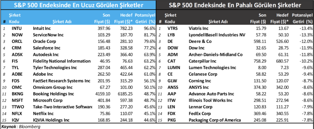 S&P 500’de en Ucuz ve en Pahalı Şirketler – Kaynak: Bloomberg