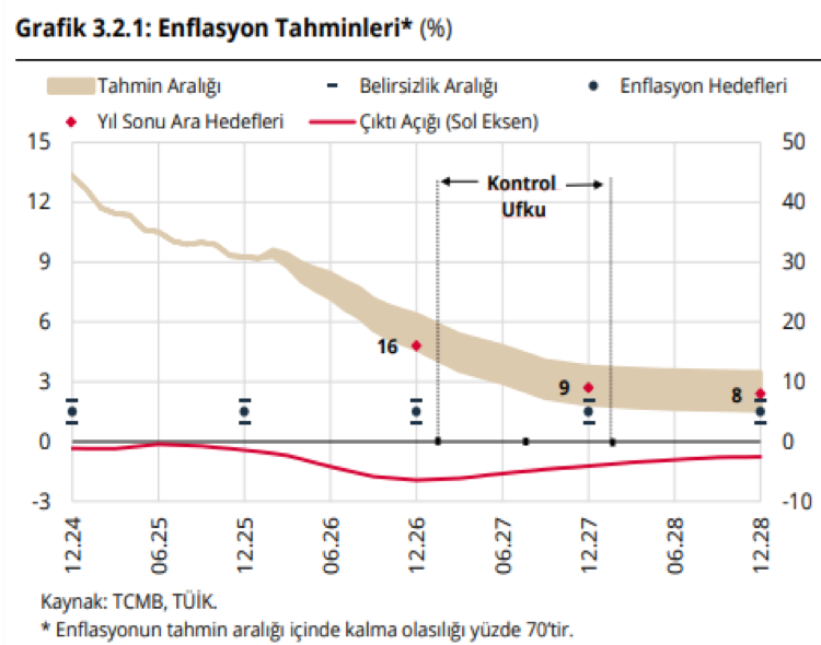 TCMB Başkanı Fatih Karahan tarafından gerçekleştirilen 2026 – 1. Çeyrek Enflasyon Raporu sunumunda 2026 yıl sonu tahmin aralığı %13 – %19 bandından %15 – %21 bandına revize edilirken, %16 seviyesinde olan ara hedef ise korundu. 2027 sonu için enflasyon tahmin aralığı %6 – %12 bandında belirlenirken, ara hedef %9 seviyesinde sabit bırakıldı. 2028 yılı için ise ara hedef %8 seviyesinde belirlendi.