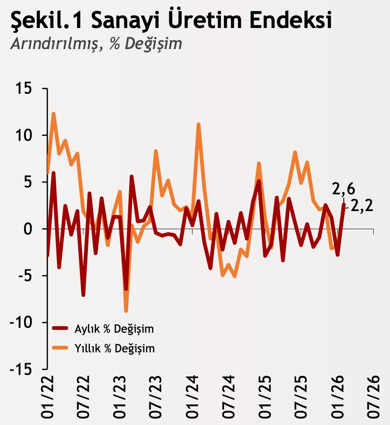 TÜİK verilerine göre sanayi üretimi Şubat ayında aylık bazda %2,6 yıllık bazda %2,2 yükseliş göstererek artarak Ocak ayındaki durgunluğu geride bıraktı. Alt sektörler incelendiğinde; madencilik ve taş ocakçılığı sektörü endeksi yıllık %4,1, imalat sanayi sektörü endeksi %2,4 artış gösterdi. Elektrik, gaz, buhar ve iklimlendirme üretimi ve dağıtımı sektörü endeksi ise %2,2 azaldı. İmalat sanayide orta yüksek teknoloji ürünlerinin imalatı öne çıkarken artış büyük ölçüde bu kalemden kaynaklandı. Madencilik tarafında ise diğer madencilik ve taş ocakçılığı imalatı öne çıktı.