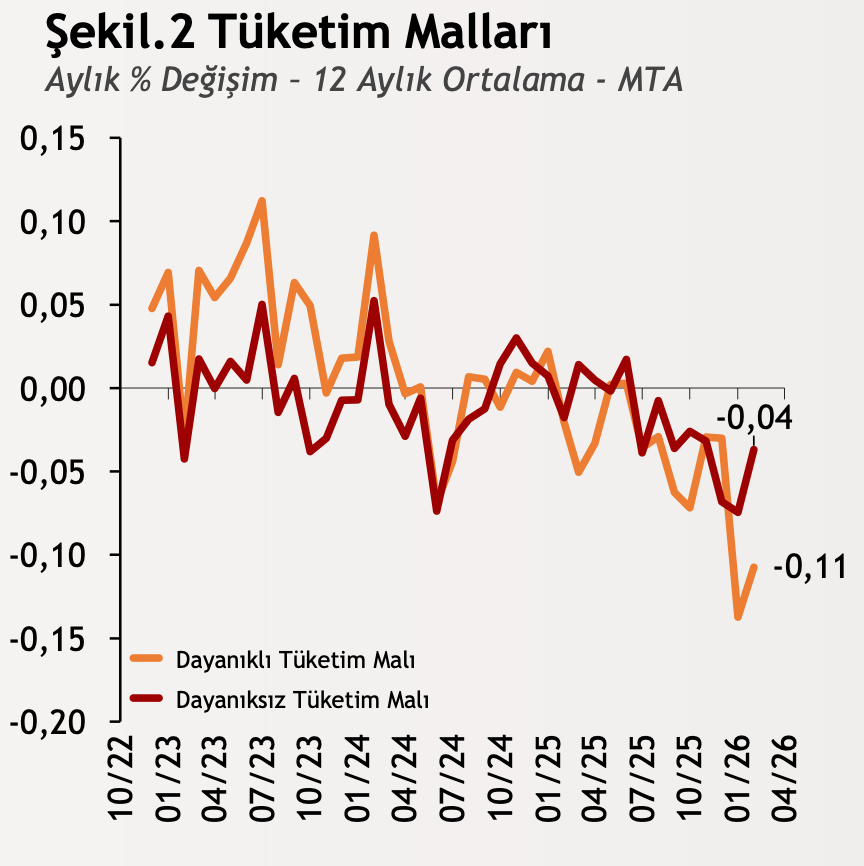 Şubat ayı sanayi üretimi verileri, tüketim malları grubunda yıllık daralmanın sürdüğünü ortaya koydu. Dayanıklı tüketim mallarında %13,8, dayanıksız tüketim mallarında ise %3,2 oranında düşüş gerçekleşti. Bununla birlikte, aylık bazda her iki sektörde de genişleme kaydedildi. Dayanıklı tüketim malları %0,7, dayanıksız tüketim malları ise %2,6 arttı. Bu gelişmeler, önümüzdeki dönemde yıllık bazda da genişleme olasılığına işaret etti.