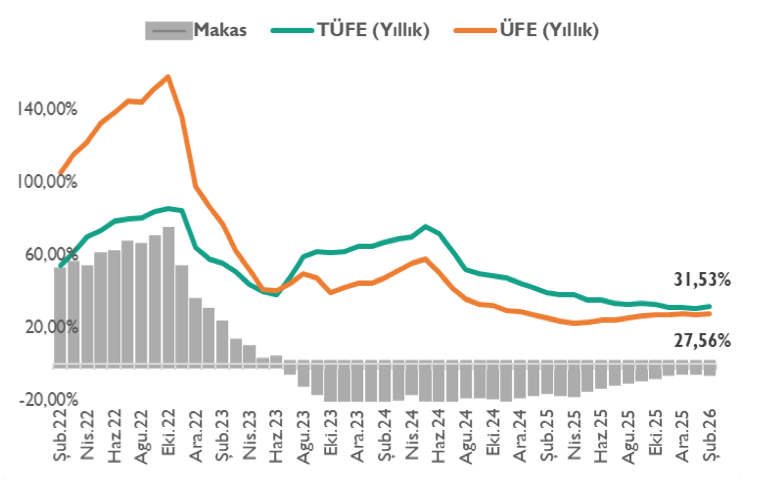 Aynı dönemde TCMB’nin brüt rezervleri 177,5 milyar dolar seviyesine gerilerken, swap hariç net rezervlerin 43 milyar dolara düşmesi rezerv yeterliliği açısından daha yakından izlenen bir görünüm ortaya koydu. Rezervlerdeki bu geri çekilme, döviz likiditesi ve dış kırılganlıklar açısından önemini koruyor. Enflasyon beklentileri tarafında ise yukarı yönlü eğilimin sürdüğü görülüyor. TCMB’nin Mart ayı verilerine göre, 12 ay sonrası enflasyon beklentisi piyasa katılımcıları için 0,07 puan artarak %22,17’ye yükselirken, reel sektör beklentisi 0,90 puan artışla %32,90’a, hanehalkı beklentisi ise 1,08 puan artarak %49,89 seviyesine çıktı.
