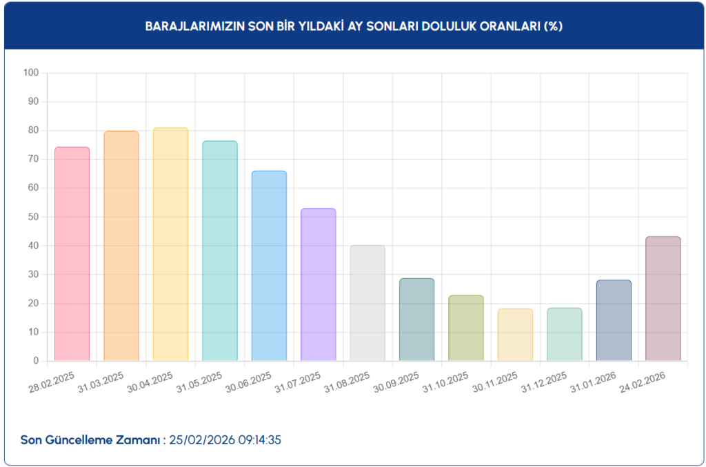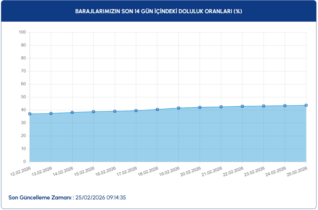 İstanbul Su ve Kanalizasyon İdaresi (İSKİ) verilerine göre İstanbul’da baraj doluluk oranları son iki haftada istikrarlı bir yükseliş eğilimine girdi. Şubat ayının başında yaklaşık %34 düzeyinde bulunan ortalama doluluk oranı, 25 Şubat 2026 ölçümünde %43.7’ye çıktı.