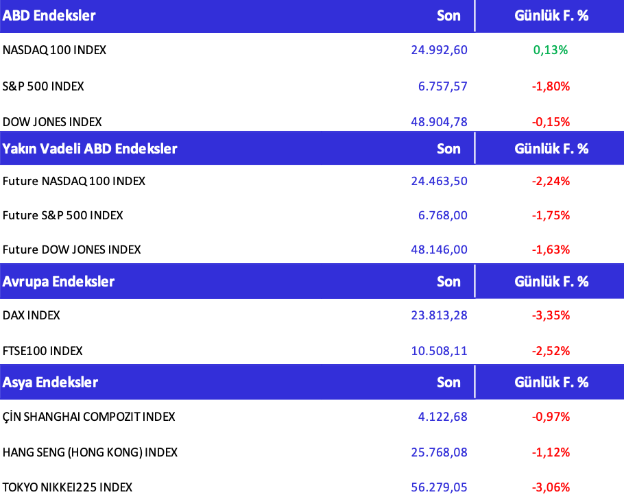 ABD Borsalarında Sert Satış: Nasdaq Vadeli %1,1 Geriledi! İran’ın Hürmüz Boğazı’nı kapatma açıklaması ve artan jeopolitik gerilim, ABD borsalarında satış baskısını artırırken petrol fiyatlarını yukarı taşıdı ve yatırımcıların riskten kaçış eğilimini hızlandırdı. Detaylar Haberimizin Devamında…