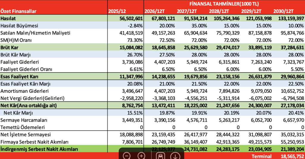 “Şirket değerlemesi için İNA(İndirgenmiş Nakit Akımları) yöntemini yüzde 100 ağırlık ile kullandık. Buna göre; 134,13 Milyar TL civarında hedef piyasa değerine ulaşılmış olup, hisse başına hedef fiyatımızı “TUT” tavsiyesi ile 27,59 TL olarak belirliyoruz.”
