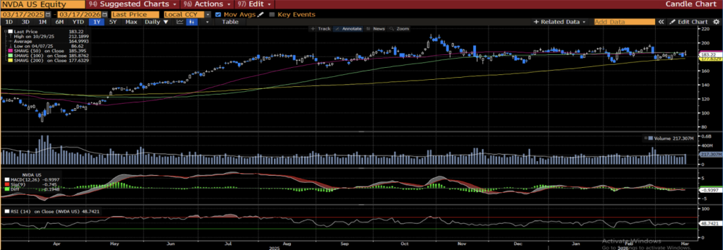 Teknik tarafta ise hisse daha dengeli bir seyir izliyor. NVDA hissesi, kısa ve orta vadeli hareketli ortalamaların altında kalsa da 200 günlük ortalamanın üzerinde tutunarak uzun vadeli yükseliş trendini koruduğunu gösteriyor. RSI nötr seviyelerde seyrederek aşırı bir baskı olmadığını teyit ederken, MACD ise momentumun kısa vadede hafif zayıf ancak stabil olduğunu işaret ediyor.