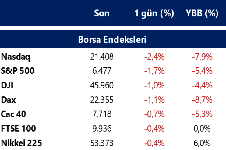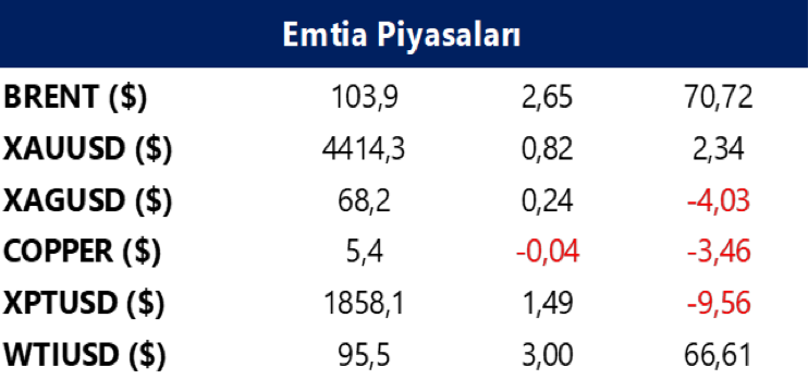 ABD vadelileri ve Avrupa piyasaları negatif seyrediyor. Asya borsalarında bugün itibariyle yatay bir görünüm hakimdi. Özetle küresel risk iştahı negatif seyrediyor. Emtia tarafında brent tipi ham petrol 103,9 $/varilde seyrederken, altının ons fiyatı 4.420 $ civarında. Bitcoin 66.600 $, Ethereum ise 1.990 $ civarında işlem görüyor.