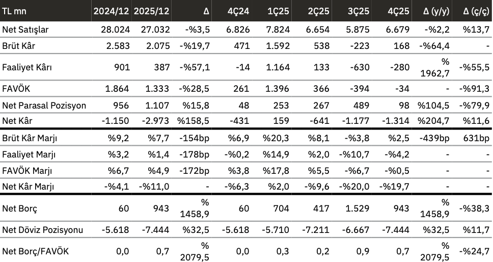 Net satışları 4. çeyrekte geçen yılın aynı çeyreğine göre %2,15 azalışla 6.679 milyon TL olmuştur. 2025 yılında bir önceki yıla göre net satışları %3,54 azalışla 27.032 milyon TL seviyesinde gerçekleşmiştir.
