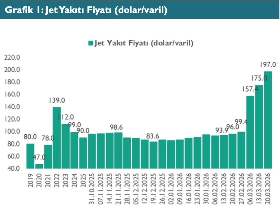 Uluslararası Hava Taşımacılığı Birliği’nin (IATA) verilerine göre 20 Mart haftasında jet yakıtı fiyatları haftalık bazda %12,6 artışla 197 dolar/varil seviyesine yükselirken, 27 Şubat’tan bu yana toplam artış %98,2’ye ulaşmış durumda. Enerji piyasalarında tırmanan jeopolitik riskler fiyatlamalar üzerinde belirleyici olmayı sürdürürken, son üç haftada ivme kazanan yükseliş eğilimi yukarı yönlü baskının devam edebileceğine işaret ediyor.