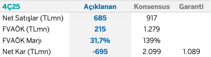 FAVÖK bu çeyrekte piyasa beklentisi olan 1.3 milyar TL’nin %83 altında 217 milyon TL seviyesinde gerçekleşti (Ç/Ç:-20,8%) (Υ/Υ: -24,3%). 2025 yılında FAVÖK 1,2mir TL oldu (Y/Y: – %13.3). FAVÖK marjı 31.7% seviyesinde gerçekleşti (Ç/Ç: -13,8 ppt, y/y: 12,4 ppt). 2025 toplam FAVÖK marjı 39,2% olup, önceki yıla göre yaklaşık 12,5 ppt artış gösterdi. Toplam satışlar bu çeyrekte piyasa beklentisinin %25 altında 685 milyon TL’ye geriledi (Piyasa: 917 mn TL), (ç/ç: 13,7%, y/y: -53,8%).