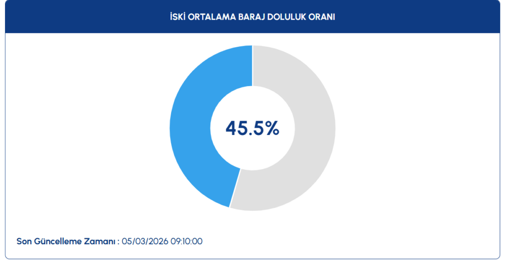İstanbul Su ve Kanalizasyon İdaresi (İSKİ) verilerine göre İstanbul baraj doluluk oranı 5 Mart 2026 itibarıyla %45.5 seviyesine çıktı.