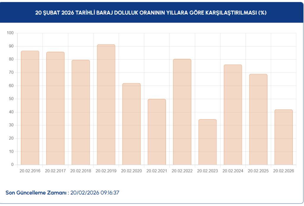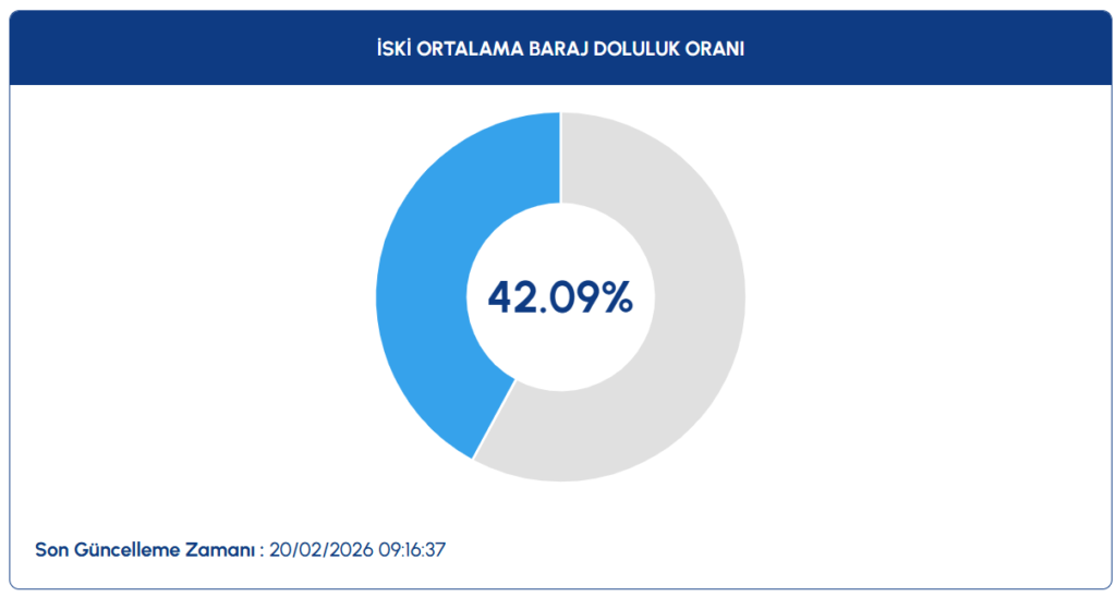 İstanbul Su ve Kanalizasyon İdaresi (İSKİ) verilerine göre İstanbul’da baraj doluluk oranları son iki haftada istikrarlı bir yükseliş eğilimine girdi. Şubat ayının başında yaklaşık %34 düzeyinde bulunan ortalama doluluk oranı, 20 Şubat 2026 ölçümünde %42,09’a çıktı.