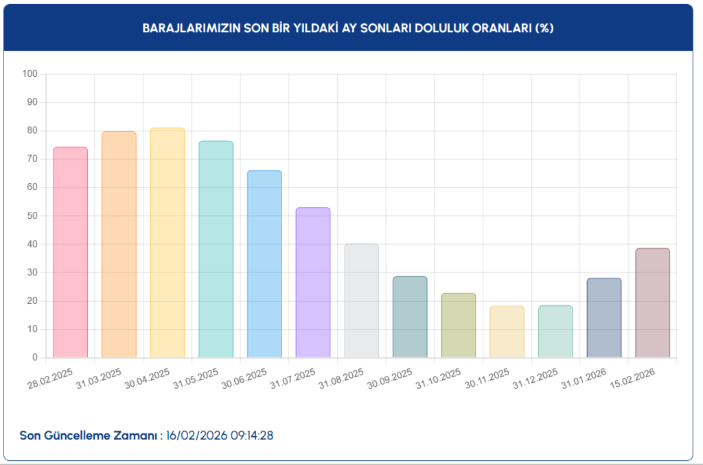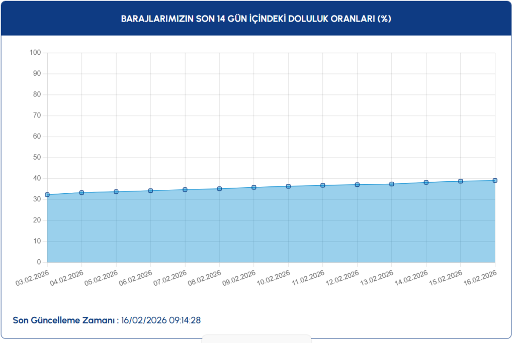 İstanbul’da milyonlarca kişinin yakından takip ettiği baraj doluluk oranları güncellendi. 16 Şubat 2026 tarihli resmi verilere göre kent genelindeki barajların ortalama doluluk oranı %39,08 olarak ölçüldü. Son iki haftalık veriler incelendiğinde doluluk oranlarının kademeli biçimde yükseldiği görülüyor.