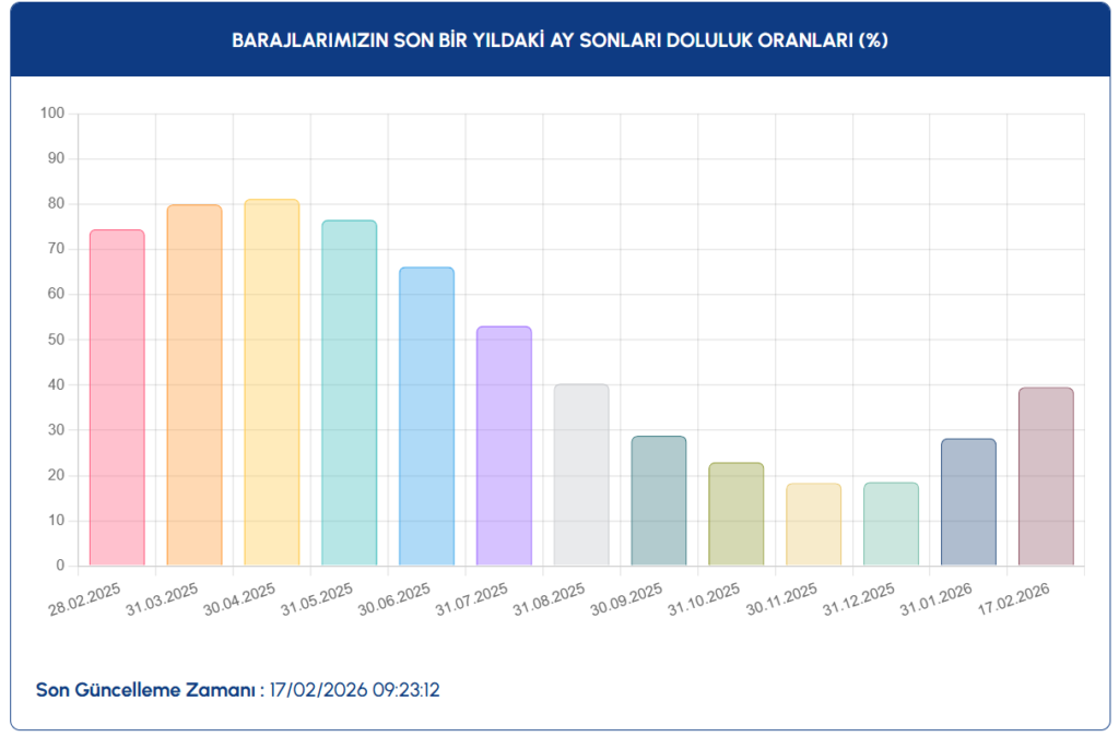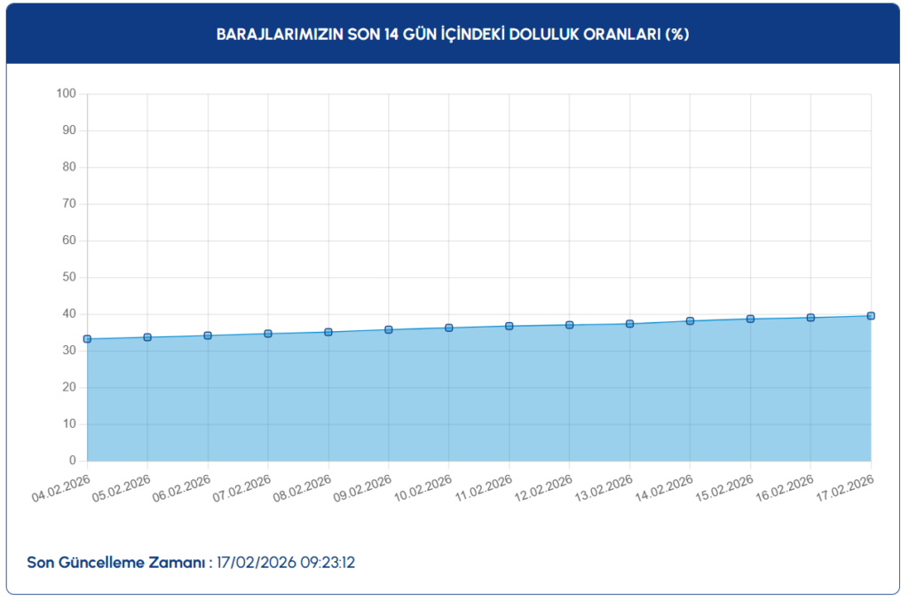İstanbul Su ve Kanalizasyon İdaresi (İSKİ) verilerine göre şubat ayı başında %32 civarında olan doluluk oranı düzenli artışla yaklaşık 7 puan yükseldi. Günlük ölçümler, 3 Şubat’ta %32,3 seviyesinden başlayan artışın 16 Şubat’ta %39,08’e kadar sürdüğünü, 17 Şubat’ta ise ortalamanın %39,56 olarak kaydedildiğini gösteriyor.
