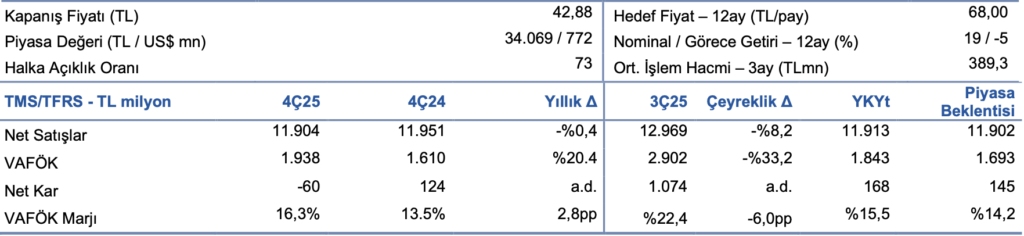 “Sonuçları olumlu olarak değerlendiriyoruz ve VAFÖK beklentilerinin aşılması ve destekleyici 2026 öngörüleri sayesinde piyasadan olumlu bir tepki bekliyoruz. Yönetim 2026 yılında mevcut tahminlerimizden daha güçlü bir gelir artışı ve fiziksel genişleme öngörüyor; bunun hisse görünümü açısından da destekleyici olmasını bekleriz. Şirket bugün saat 16:00’da (TSİ) bir telekonferans düzenleyecek, yönetimi dinledikten sonra model varsayımlarımızı gözden geçireceğiz. Şimdilik, model portföyümüzün de bir üyesi olan MAVI için, 12 aylık 68TL/hisse hedef fiyatımızı ve AL tavsiyemizi koruyoruz.”