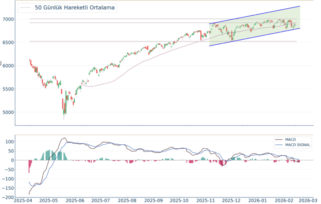 Geçtiğimiz günü %0.28 düşüşle tamamladı. S&P 500 Endeksi 20 günlük hareketli ortalamasının altında kapanış gerçekleştirerek aylık negatif görünümünü sürdürdü. Yukarı yönlü hareketlerde izlenebilecek birinci direnç 7.006 olurken destek olarak 6.805 izlenebilir.