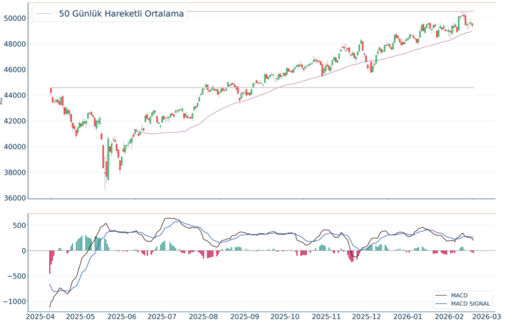 Dow Jones Endeksi dün gerçekleşen işlemlerde en yüksek 49.606, en düşük ise 49.197 seviyesinde işlem gördükten sonra %0.54 azalarak azalarak 49.395 seviyesinde günü tamamladı. 20 günlük hareketli ortalamanın altında hareket etmesi ise Dow Jones Endeksi adına olumsuz olarak nitelendirilebilir. Gün içi işlemlerde 49.004 ve 48.205 desteklerini ve 50.476 ve 50.787 dirençlerini takip edeceğiz.