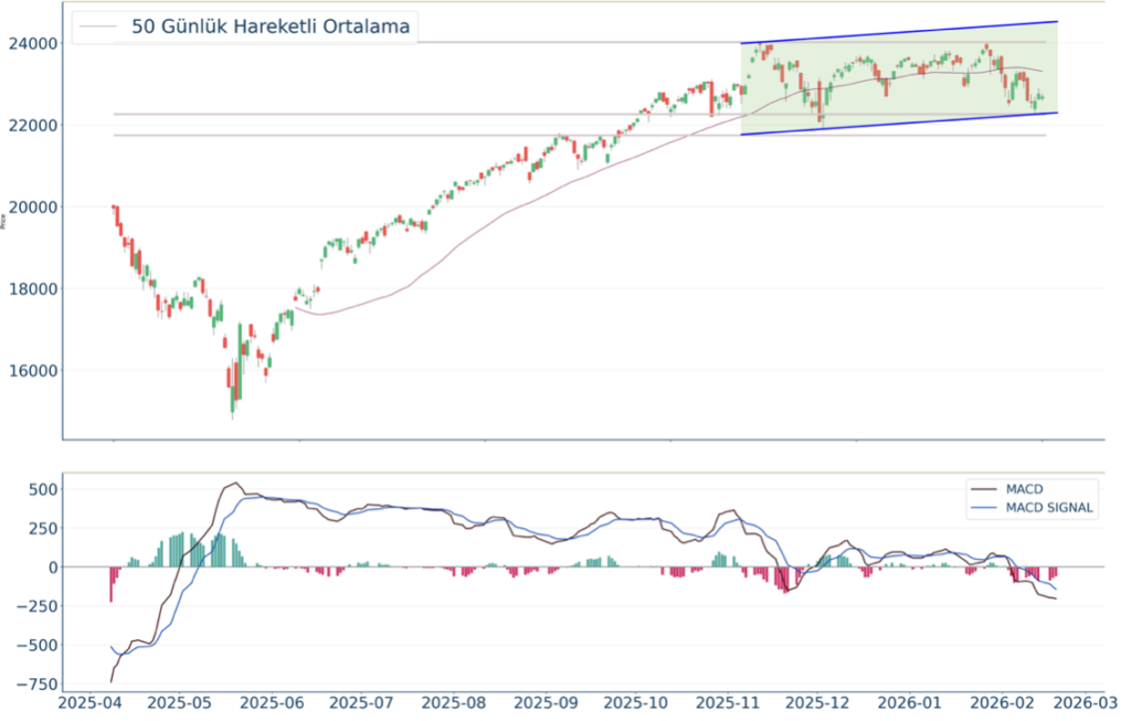 Nasdaq Endeksi, geçtiğimiz günü %0.31 düşüş ile kapattıktan sonra, 20 günlük hareketli ortalaması olan 23.162 seviyesinin altında fiyatlanıyor. Bu durum Nasdaq Endeksi için aylık periyotta negatif bir görüntü çiziyor. Son günde yapılan işlemlerde ise en yüksek 22.768 seviyesinde işlem gördükten sonra günü 22.682 seviyesinde tamamladı. Öte yandan, trend göstergelerinden biri olan MACD sat pozisyonunda, negatif bölgede hareket ediyor. 23.173-23.317 dirençler, 22.498-22.134 destekler olarak değerlendirilebilir.