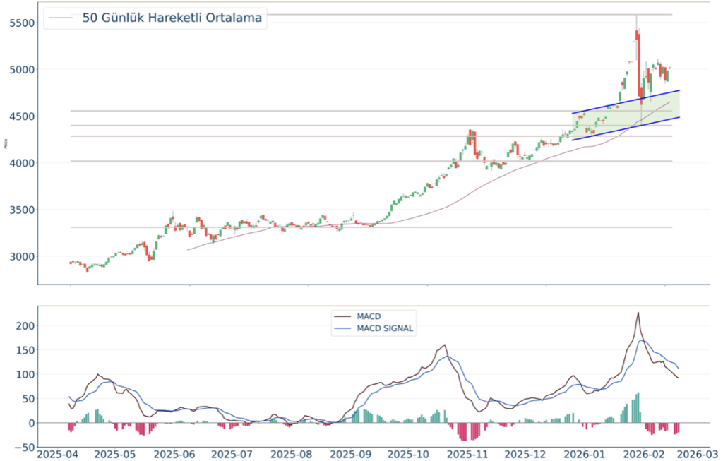 Ons Altın kapanışla birlikte %0.53 yükseliş gerçekleştirdi. Güne 5.015 seviyesinde başladı ve gün içinde en yüksek 5.033, en düşük 5.003 seviyesinden işlem gördü. Kapanışı ise 5.012 seviyesinde tamamladı. Kısa vadede pozitif görüntü hakimdir. MACD çizgisi sinyal çizgisinin altında, pozitif bölgede yer alıyor. Yukarı yönlü hareketlerde izlenebilecek birinci direnç 5.123 olurken destek olarak 4.977 izlenebilir.