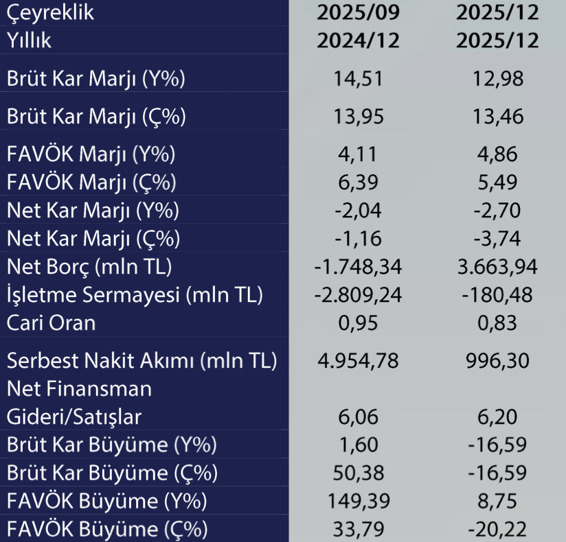 Yılın tamamında ise disiplinli fiyatlandırma stratejisi, etkin stok yönetimi, iyileşen satış devir hızı ve daha yüksek marjlı kategorilere artan odaklanma dahil 2025 yılında devreye alınan aksiyonlarla yıllık bazda brüt kar marjı 60 baz puan artışla %13,5 seviyesine yükselmiştir. Bu çeyreklik etkileşimin ardından yeni yılda koşulların iyileşip sürece etkisini yakından takip ediliyor olacak.