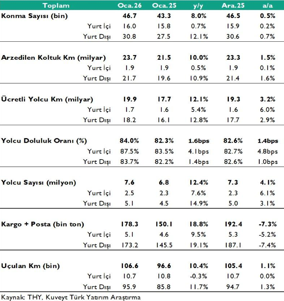 Türk Hava Yolları Ocak Ayında 7,6 Milyon Yolcu Taşıdı, 400 TL Hedef Fiyat Korundu! Türk Hava Yolları, Ocak ayında yolcu sayısını yıllık bazda %12,4 artırarak 7,6 milyona çıkarırken, artan doluluk oranı ve kargo hacmi operasyonel büyümenin sürdüğüne işaret etti. Detaylar Haberimizin Devamında…