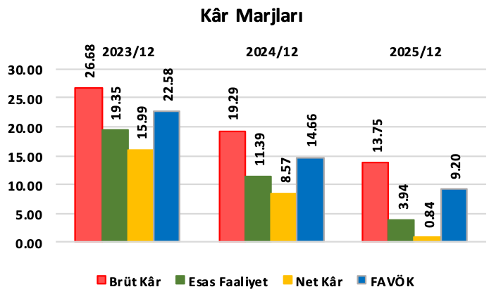 ➤ Şirketin, 2025/12 döneminde elde ettiği Hasılat; geçen yılın aynı dönemine (2024/12) göre 33,82 Milyar TL(yüzde 38,58)’lik keskin azalış(-) göstererek, 53,84 Milyar TL düzeyinde gerçekleşmiştir. Satışların Maliyeti ise; aynı dönemler arasında 24,31 Milyar TL civarında (yüzde 34,37) azalmış ve 45,43 Milyar TL olmuştur.
