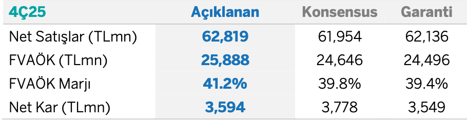 4Ç25’te 4.581mn TL kaydedilen yüksek vergi giderine (4Ç24’te 1.251mn TL) ve 8.662mn TL net finansal gidere karşın (4Ç24’te 4.482mn TL), net kar artışında faaliyet karında yıllık %36 artış ve 5,426mn TL net diğer gelir ve 2,479mn TL yatırım faaliyetlerinden gelir etkili olmuştur.