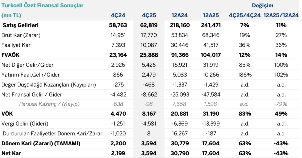 Turkcell’de Faturalı Abone Sayısı 2,4 Milyon Arttı! Turkcell, 2025 Yılı 4. Çeyreğinde 3,6 Milyar TL Net Kâr Açıklarken, Gelirlerdeki Artış ve Abone Büyümesi Operasyonel Performansı Desteklemeye Devam Etti. Garanti BBVA 4Ç25 Finansal Sonuçlarını Değerlendirdi ve Hedef Fiyatını Korudu. İşte Detaylı Analiz…