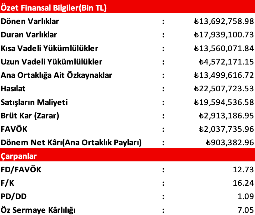 Şirketin, 2025/12 döneminde elde ettiği Hasılat; geçen yılın aynı dönemine (2024/12) göre 6,98 Milyar TL(yüzde 44,92) civarında artış göstererek, 22,51 Milyar TL olarak gerçekleşmiştir. Satışların Maliyeti ise; aynı dönemler arasında 6,09 Milyar TL civarında (yüzde 45,07) artmış ve 19,59 Milyar TL olmuştur.